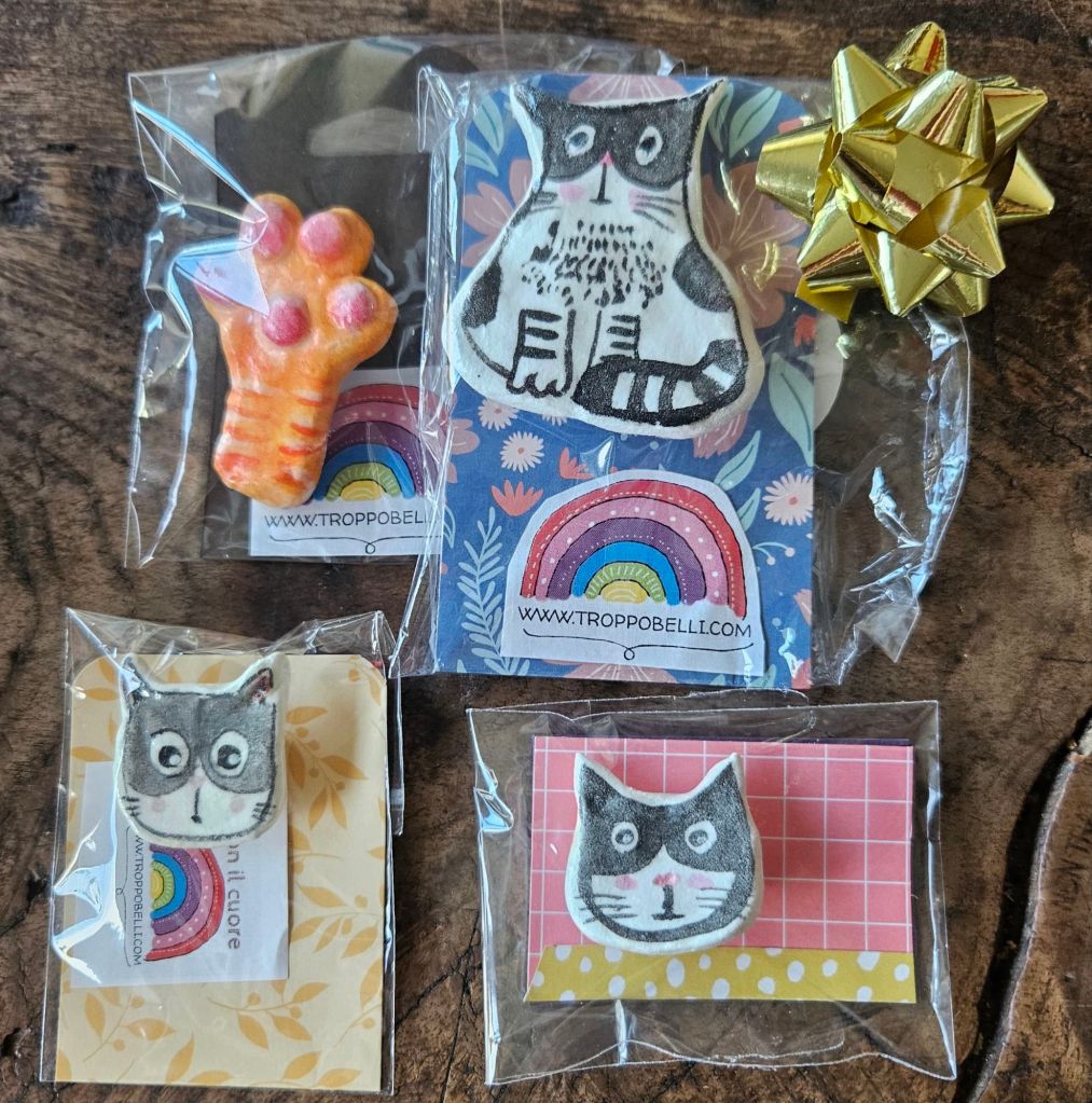 In questa giornata speciale per tutti gli amici gattari vogliamo presentarvi le nostre spilline gattesche che saranno molto apprezzate da tutti (anche da chi non ha gatti). Tutte realizzate dalla nostra M@m in argilla, decorate a mano, in pezzi unici. Ma qualche uccellino ci ha detto che forse ne stanno arrivando alcune fatte in pannolenci!